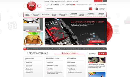 Проект IT-точка вместил в себе все, что может понадобится в любом интернет-магазине, например, популярная продукция, каталог товаров, меню по разделам, регистрация, личный кабинет покупателя, статьи и новости. Если копнуть глубже, то найдем фильтр товаров по свойствам, сортировку товаров, возможность добавить в избранное, а также историю покупок пользователя.