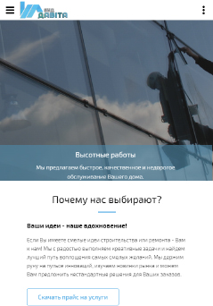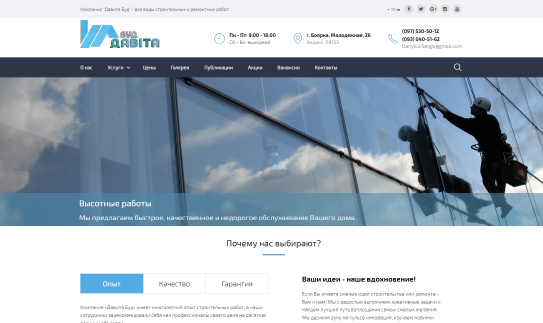 Нашей задачей было создать простой сайт, где были бы описаны все услуги компании. Также мы добавили на сайте прайс по всех работах для самостоятельно просчета стоимости клентами нужных им услуг. А чтобы ближе познакомится с компанией разместили в галереи фотографии с обьектов, на которых работали ребята с Давита Буд.